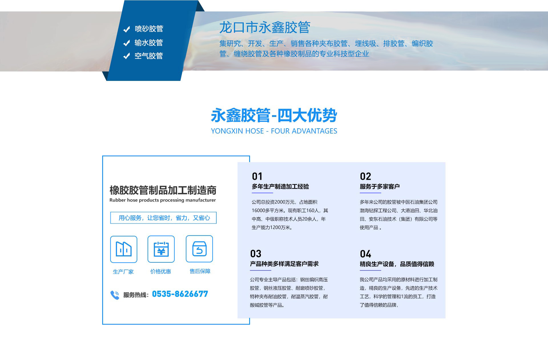 龍口市永鑫膠管有限公司始建于1979年。位于山東半島北端——龍口市,毗鄰龍口港、威烏高速公路和大萊龍鐵路,商業(yè)運(yùn)輸,交通方便,地理位置好。公司總投資2000萬元,占地面積16000多平方米?,F(xiàn)有職工160人,其中高、中級(jí)職稱技術(shù)人員20余人,年生產(chǎn)能力1200萬米。多年來公司的膠管被中國石油集團(tuán)公司渤海鉆探工程公司、大港油田、華北油田、安東石油技術(shù)(集團(tuán))有限公司等使用產(chǎn)品我公司迎著十八界三中全會(huì)的改革大潮始終闊步向前,目前我公司主要從事高低壓橡膠軟管、鉆探膠管、夾布膠管、噴砂膠管、橡膠管帶制品,等產(chǎn)品的生產(chǎn)和研發(fā),主導(dǎo)產(chǎn)品包括:生產(chǎn),研制高低壓橡膠軟管、輸送皮帶等以橡塑為主的產(chǎn)品,擁有各類進(jìn)口,國產(chǎn)生產(chǎn)設(shè)備120多臺(tái)套,化驗(yàn),分析,試驗(yàn)儀器設(shè)備種類多,檢測手段完善。我公司產(chǎn)品均采用的原材料進(jìn)行加工制造,精良的生產(chǎn)設(shè)備和穩(wěn)定技術(shù)工藝,科學(xué)的管理,打造了客戶信任的牌子,先后與多家石油、化工、汽車制造等大型國有企...
